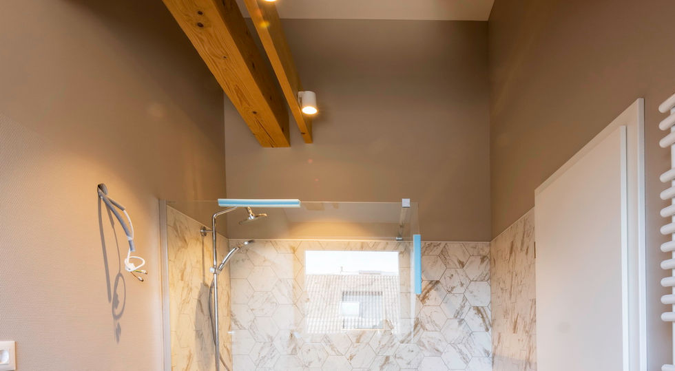 Arne in Katja imata rada svetle prostore, za delo pa potrebujeta popolno temo, prav zato sta se odločila za veliko oken, tako v fotografskem studiu kot v mansardi, a imajo vsa okna možnost popolne zatemnitve z zunanjimi senčili, tudi izjemno velika panoramska okna podjetja Satler. V fotografskem studiu sta prav tako dve veliki okni istega proizvajalca in štiri strešna okna proizvajalca Velux, ki so zaradi skoraj petmetrske višine stropa v studiu za odpiranje in popolno zatemnjevanje, seveda, tudi električno krmiljena. Fotografski studio je lahko torej svetel prostor ali pa črna luknja, a ne glede na to, kakšna svetloba razsvetli prostor, se zaradi belih sten ne obarva. Za marsikoga nepomemben podatek, a odboj svetlobe od barvitih sten je lahko za fotografe kar velika težava. Prav zato sta Arne in Katja izbrala Jupol Classic. »Le v kopalnici in toaletnem prostoru sva si dovolila malo več barvitosti, zato smo stene obarvali v pastelno zeleni in bež barvi,« nam zaupa Katja. Prenova mansarde ima tudi svoje specifičnosti in ena izmed njih je zagotovo v špico zašiljen strop, ki je v domu fotografov ostal nespremenjen. V večini prostorov je namreč vidno veliko leseno ostrešje, ki ga je bilo treba prav tako zaščititi in odločili so se za Jubin, nevtralen premaz za les na vodni osnovi podjetja JUB.